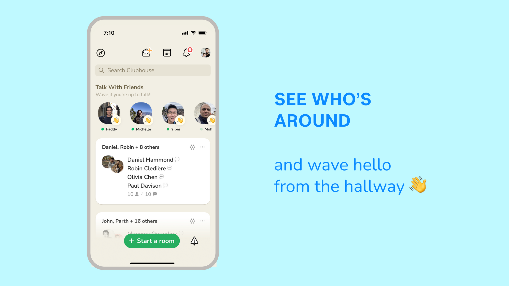 We’re testing a handy lil' bar at the top of your screen where you can easily see who's online, and wave to start up a room with them without spending your thumb's precious energy on a sidebar.
