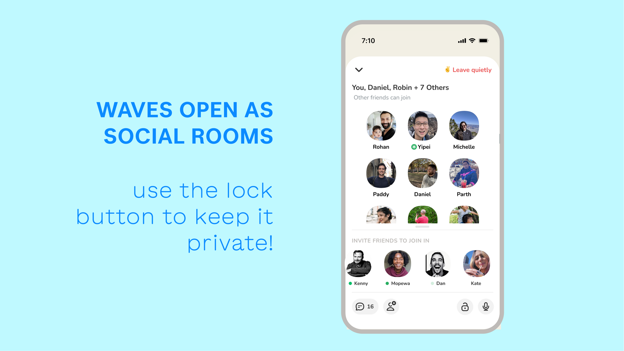 Waves will now open social rooms instead of private rooms, so that friends of speakers can join the conversation, and speakers can ping in friends. There’s also a new ping bar at the top of social rooms so you can ping friends in quickly.