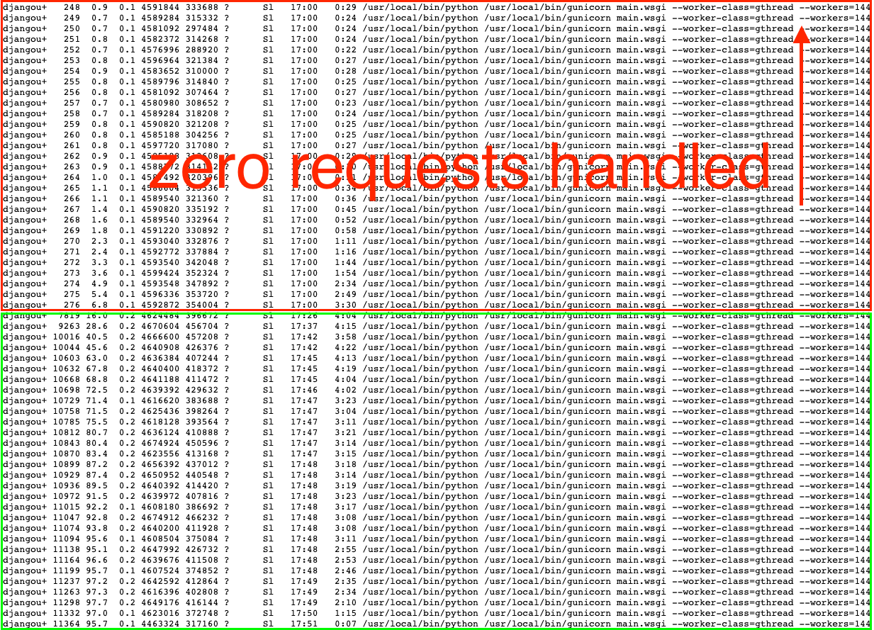 We were stumped. We spent hours prowling for some system-level limitations. (Surely, it was some random kernel limit or resource that we were silently hitting…) Instead, what we found was far more shocking: only 29 of our 144 Gunicorn processes on these enormous (and expensive) machines were receiving any requests at all! The other 115 processes were sitting idle.