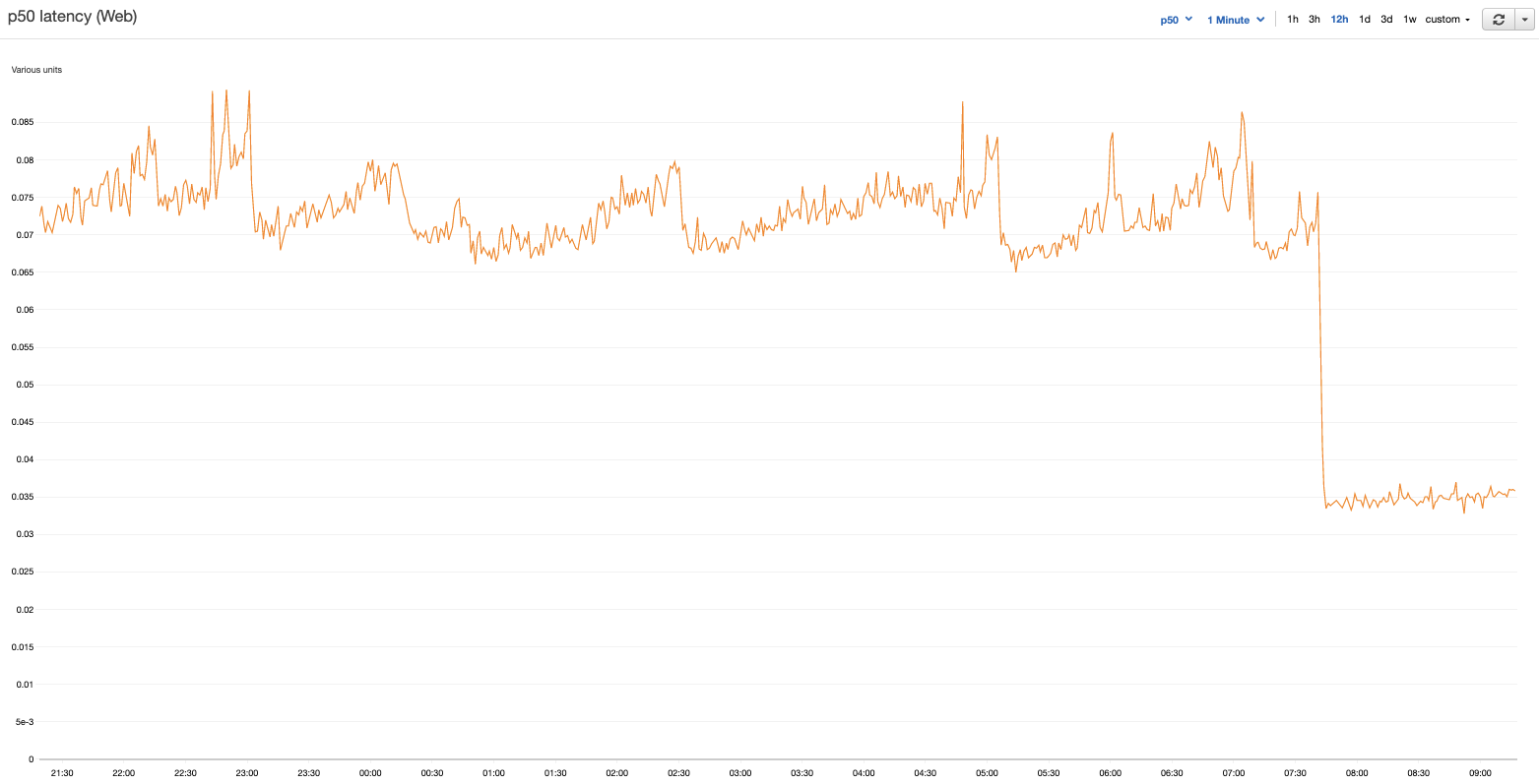 We quickly deployed uWSGI to replace Gunicorn and, much to our delight, average latency dropped by 2x! Load was now spread evenly across all 144 processes. All seemed well. The emoji reactions piled in on Slack. This graph is gravy!