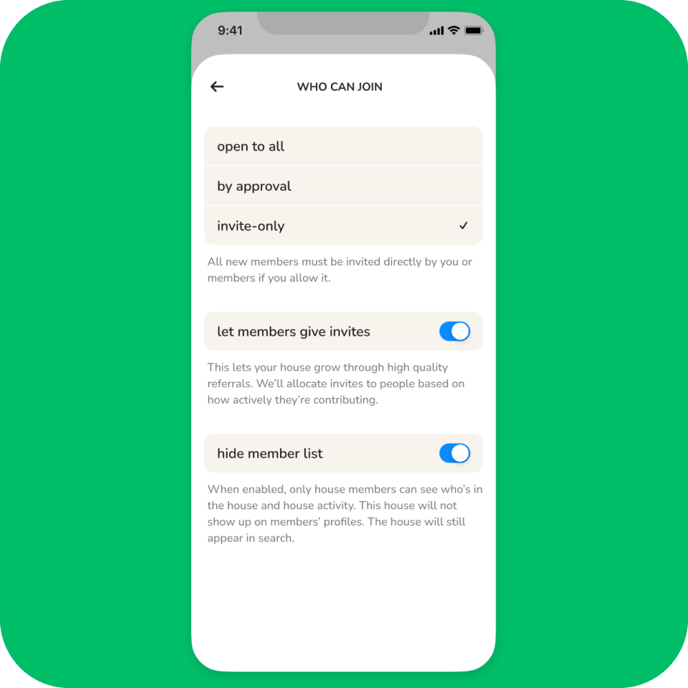 - Control who’s invited – House founders can decide who joins their House and how it grows. You have the option to make your House open for anyone, allow new members by approval, or keep it invite-only. For approved memberships and invite-only Houses, you can even control how many invites your members receive to bring new members on board.